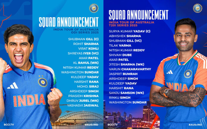 नई दिल्ली। बीसीसीआई ने ऑस्ट्रेलिया दौरे के लिए भारत की वनडे और टी20 टीम की घोषणा कर दी है। टेस्ट और टी20 इंटरनेशनल से संन्यास ले चुके दिग्गज बल्लेबाज रोहित शर्मा और विराट कोहली की वनडे टीम में वापसी हुई है।