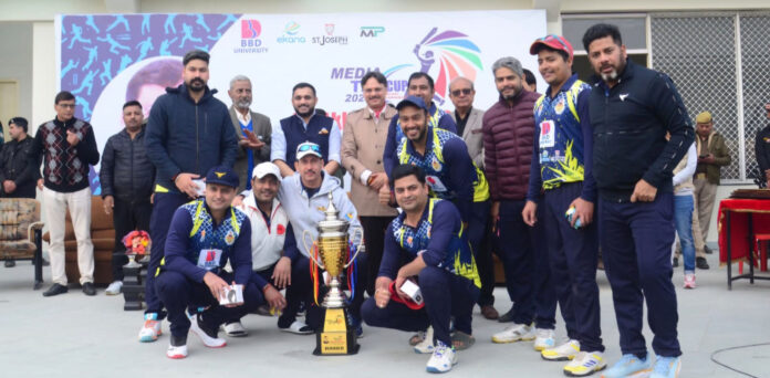 लखनऊ। अंतिम ओवर तक चले रोमांचक मुकाबले में दिल्ली इलेक्ट्रॉनिक मीडिया एकादश ने शानदार खेल दिखाते हुए डा.अखिलेश दास गुप्ता मेमोरियल ऑल इंडिया मीडिया क्रिकेट टूर्नामेंट की विजेता ट्रॉफी मेजबान यूपीएसजेए एकादश को चार रन से हराकर जीत ली।