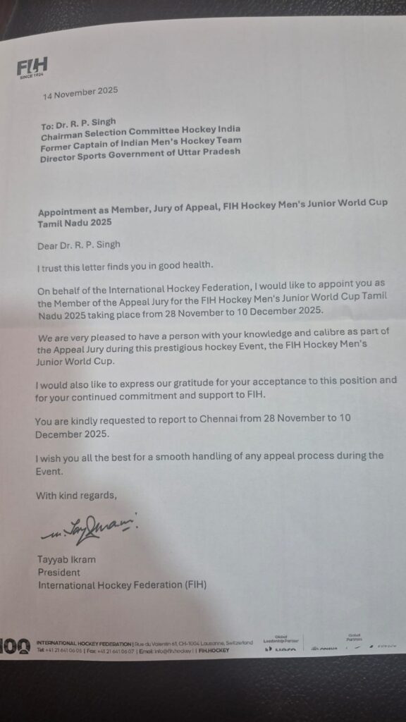 लखनऊ। पूर्व अंतर्राष्ट्रीय हॉकी खिलाड़ी व अब खेल प्रशासक के तौर पर हॉकी के प्रमोशन के लिए सक्रिय उत्तर प्रदेश के डा.आरपी सिंह एफआईएच पुरुष हॉकी जूनियर वर्ल्ड कप में जूरी आफ अपील के सदस्य के रुप में जिम्मेदारी निभाएंगे।