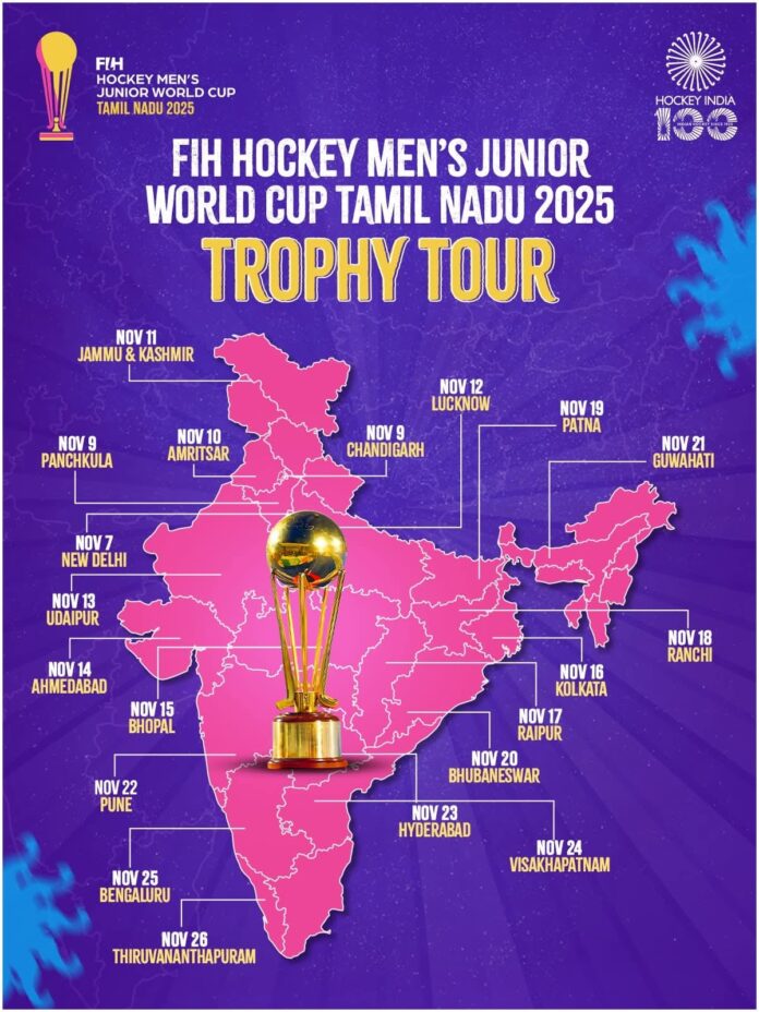 एफआईएच हॉकी पुरुष जूनियर विश्व कप (14वां संस्करण) तमिलनाडु 2025, जो चेन्नई एवं मदुरई में दिनांक 28 नवम्बर से 10 दिसम्बर 2025 तक आयोजित होगा, अपनी ट्रॉफी टूर यात्रा के अंतर्गत लखनऊ पहुंचेगा। इस ट्रॉफी का भव्य स्वागत उत्तर प्रदेश की राजधानी लखनऊ में किया जाएगा।