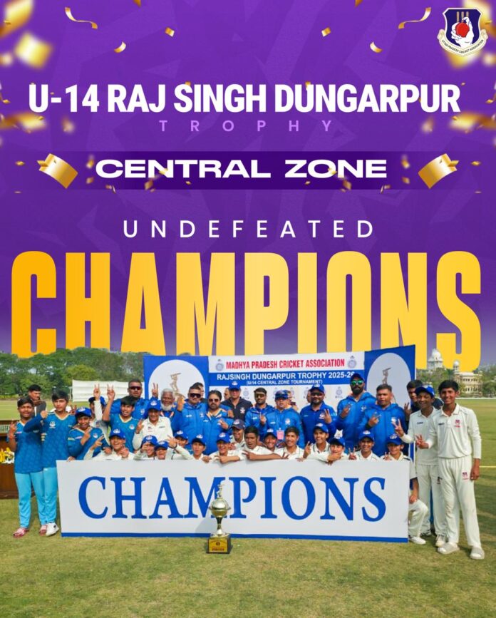 लखनऊ। युवा बल्लेबाज़ों के दमदार प्रदर्शन से सजी उत्तर प्रदेश की अंडर-14 टीम ने सेंट्रल ज़ोन में अपना वर्चस्व साबित करते हुए बीसीसीआई की राज सिंह डूंगरपुर ट्रॉफी पर कब्ज़ा जमा लिया। हर्ष सिंह और आयुष्मान यादव के शानदार शतकों की बदौलत उप्र ने राजस्थान को पहली पारी की विशाल बढ़त के आधार पर पछाड़कर इस सीज़न की अपनी पहली ट्रॉफी अपने नाम की।