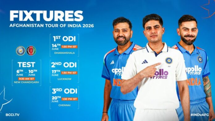 दौरे की शुरुआत 6 से 10 जून 2026 तक न्यू चंडीगढ़ में होने वाले एकमात्र टेस्ट से होगी। यह मुकाबला विश्व टेस्ट चैंपियनशिप का हिस्सा नहीं होगा, क्योंकि अफगानिस्तान अभी डब्ल्यूटीसी का सदस्य नहीं है।