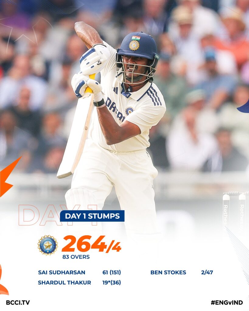 उनके जाने के बाद साई सुदर्शन भी ज्यादा देर नहीं टिक सके और 61 रन बनाकर स्टोक्स का दूसरा शिकार बने। इसके बाद जडेजा और ठाकुर ने संयम से खेलते हुए पहले दिन की समाप्ति तक टीम को और झटकों से बचाए रखा। इंग्लैंड की ओर से कप्तान बेन स्टोक्स ने 2 विकेट लिए, जबकि क्रिस वोक्स और लियाम डॉसन को 1-1 सफलता मिली।